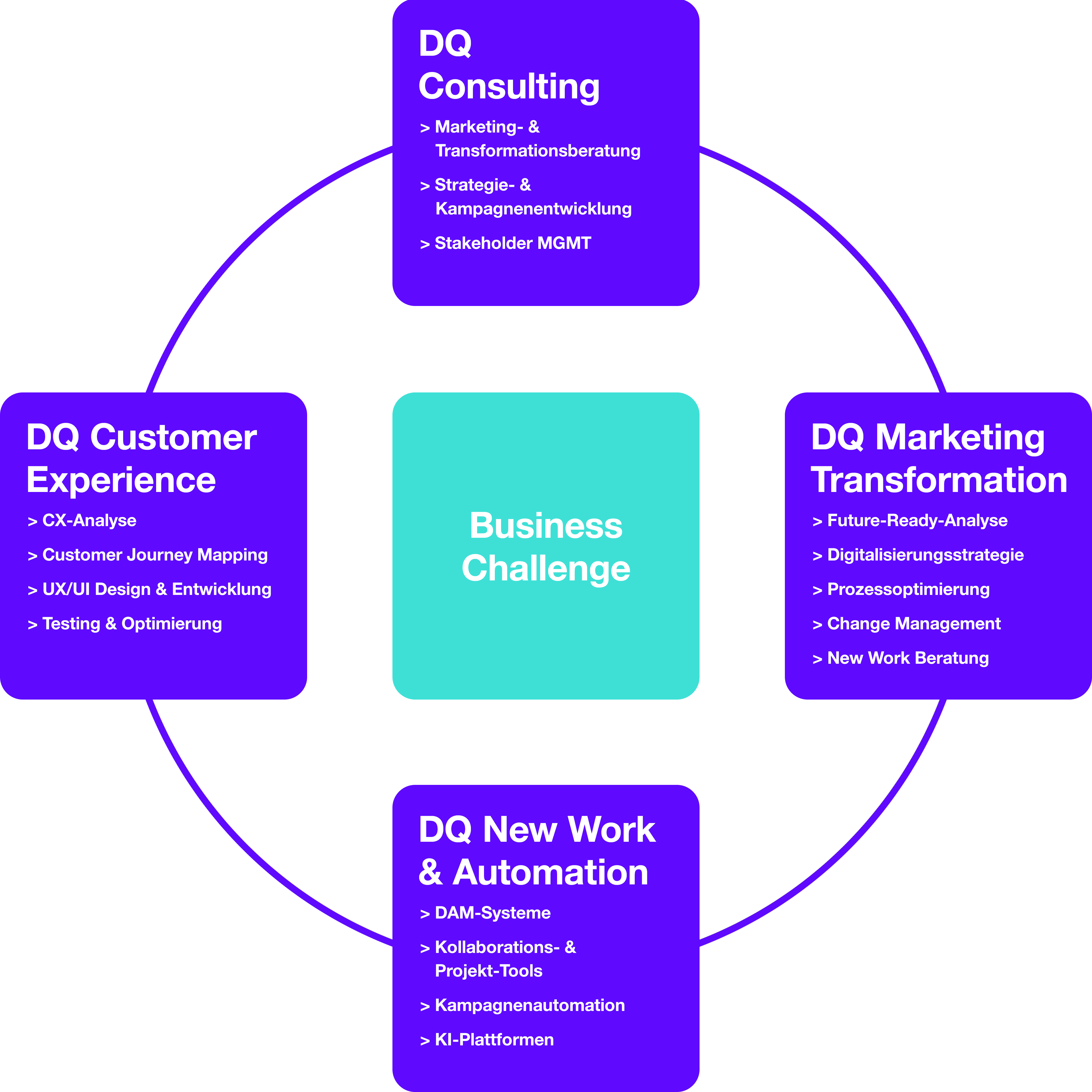 DQ startet mit Ihnen Ihre individuelle Transformation und revolutioniert Ihr Marketing. Von der GAP-Analyse zum neuen Marketing Zielbild, über die strategische Neuausrichtung und Prozessoptimierung bis hin zur Implementierung von innovativen Technologien und Tools.